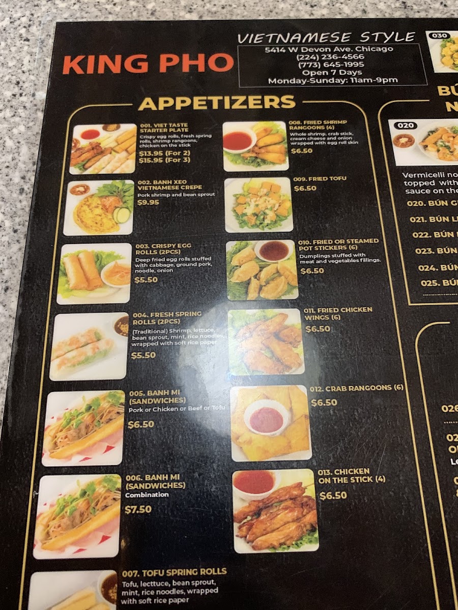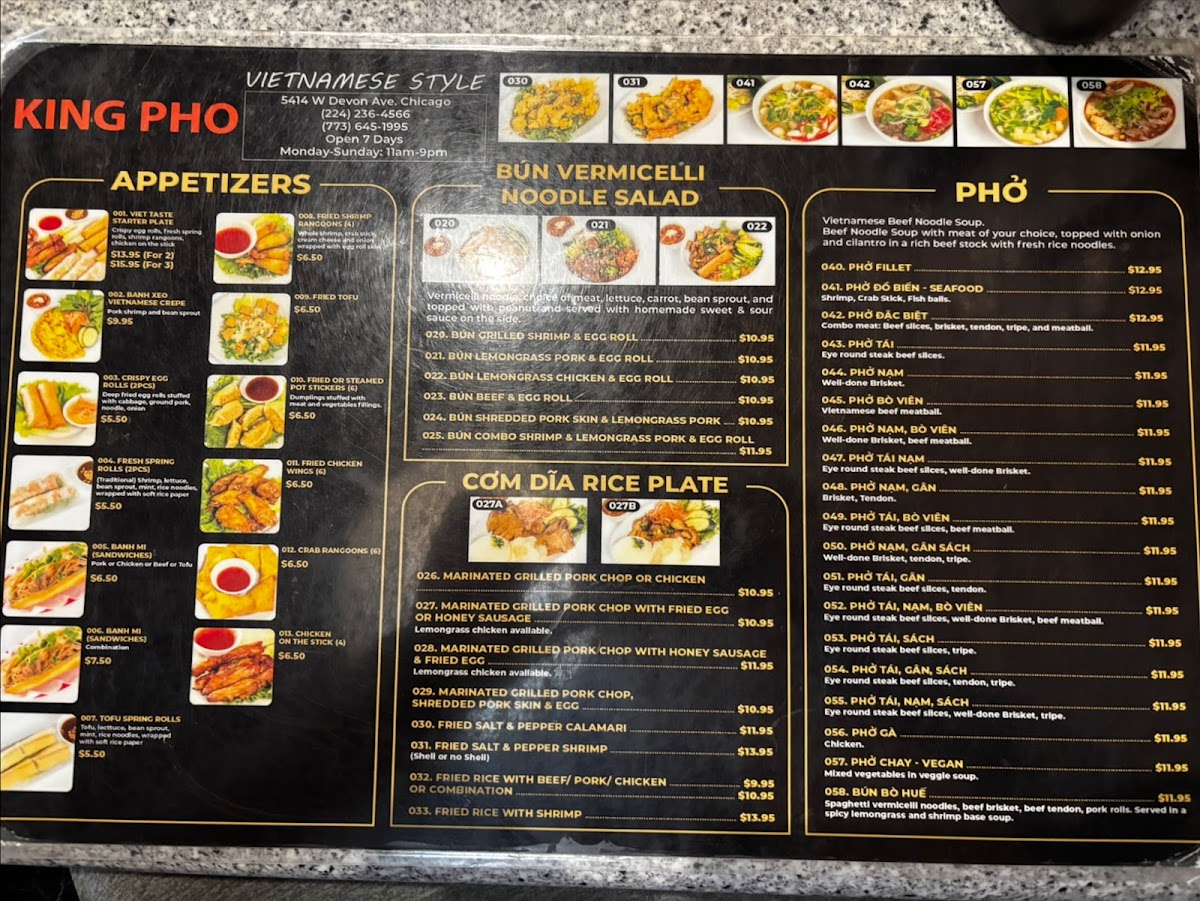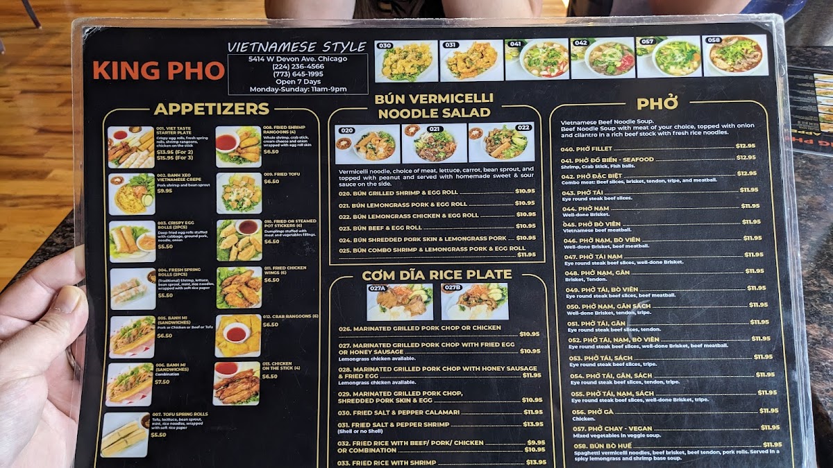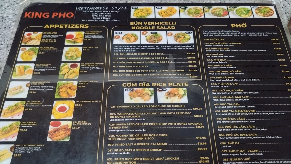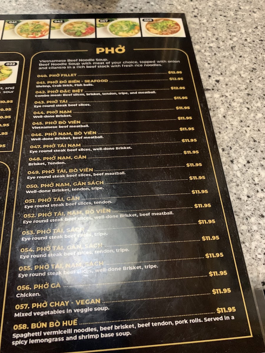 The menu features a variety of traditional Vietnamese dishes with an emphasis on pho, complemented by a range of appetizers, rice plates, and noodle dishes. Visitors can expect to find multiple versions of pho, including options such as Phở Tái (rare beef), Phở Nạm (brisket), Phở Bò Viên (beef meatball), and specialty combinations like Phở Đặc Biệt (special pho) and Phở Đồ Biển (seafood pho). Each pho offering is served with classic accompaniments such as herbs, sprouts, lime, and chili.