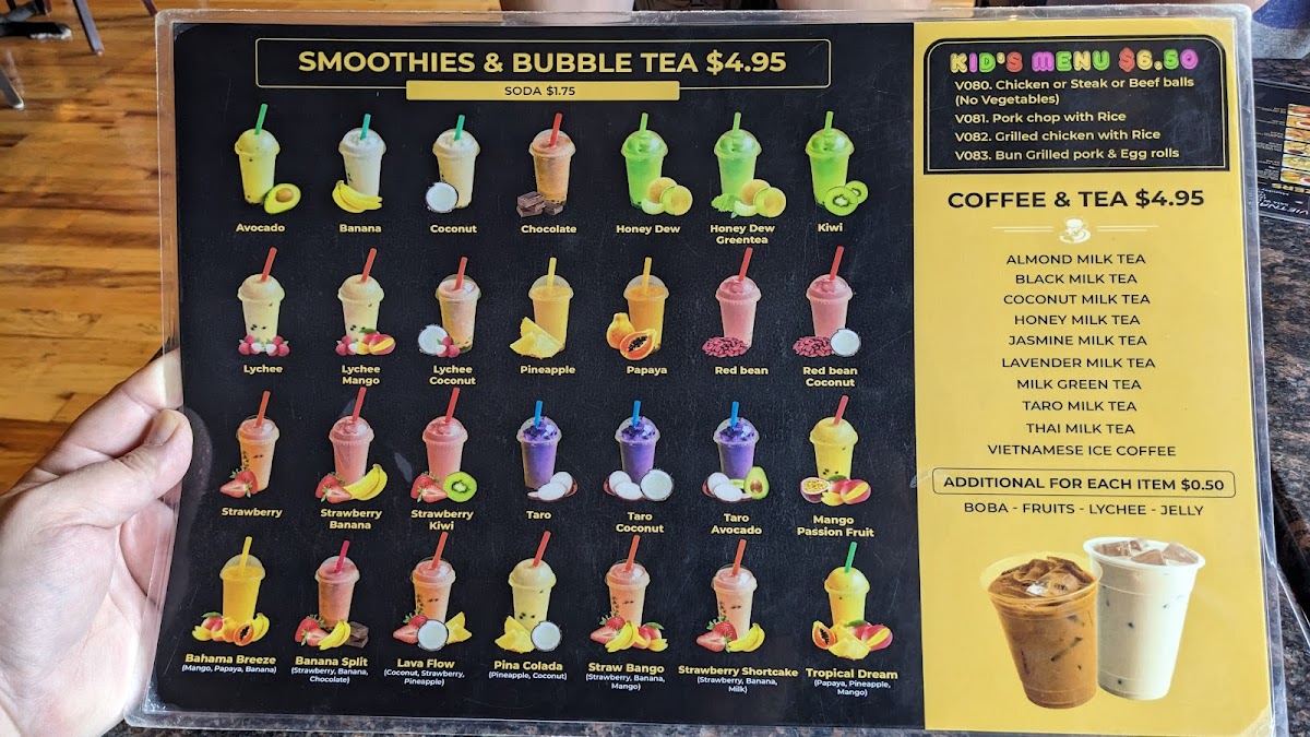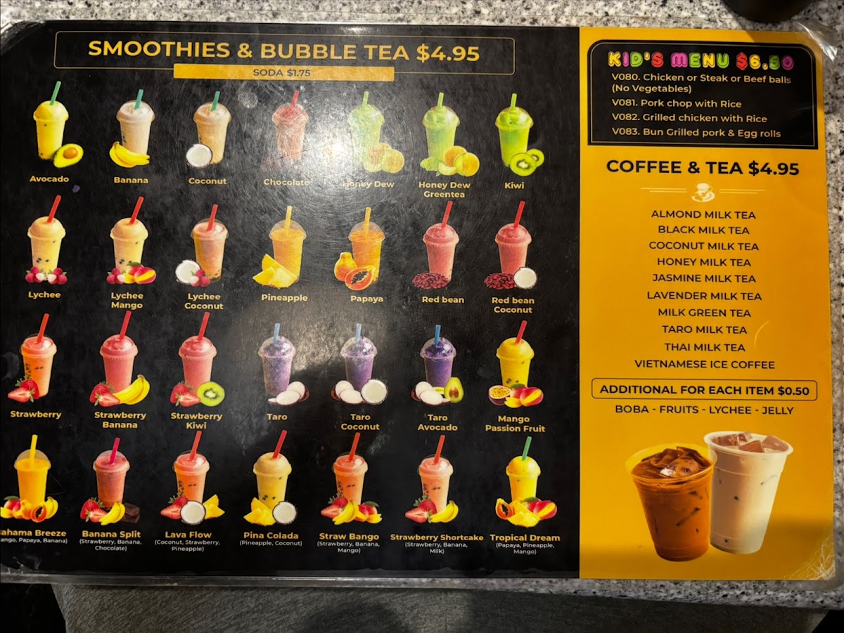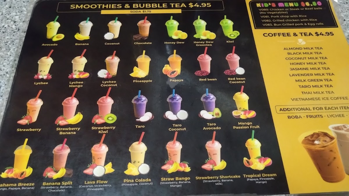 The menu also offers vegetarian options, including dishes like Kungpao Peanut Tofu and vegan pho. Beverage selections include smoothies, with options like avocado smoothie available.