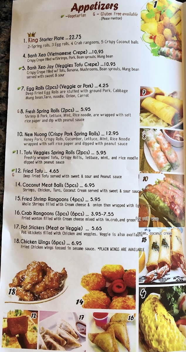 Other main dishes include diverse rice plates (Cơm Dĩa) with various protein choices, shredded pork skin, and lemongrass pork, as well as noodle dishes like Pad Thai and Singapore Noodles. Appetizers feature items such as shrimp spring rolls served with peanut sauce, shrimp rangoon, crab rangoon, and bánh xèo (Vietnamese savory pancakes).
